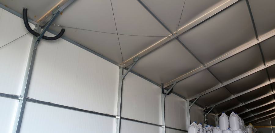 První stanovou halu s podhledem THERMO realizovala společnost Pol-Plan pro společnost Snebo, evropského giganta na trhu zpracování cibule. Hala (25x100x6m), která má sloužit jako sklad, zpracovna cibule a logistické centrum, má stěnové opláštění ze 100mm PUR desek s jádrem a podhled THERMO zavěšený pod střechou z PVC plachty. Podhled THERMO tvoří díky 5mm izolační vrstvě (polyethylenová pěna s obložením z polyethylenové fólie, potažené hliníkovou vrstvou, přišitou k 610g plachtovému materiálu) těsně přiléhající vrstvu ke stěnám z panelů a hlavním profilům. Tím se zároveň vytvoří vzduchová vrstva mezi plachtovou střechou a podhledem, která dále izoluje vnitřní prostor haly.